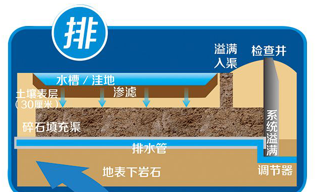 改變各種路面、地面鋪裝材料,改造屋頂綠化,調整綠地豎向,從源頭將雨水留下來然后“滲”下去。